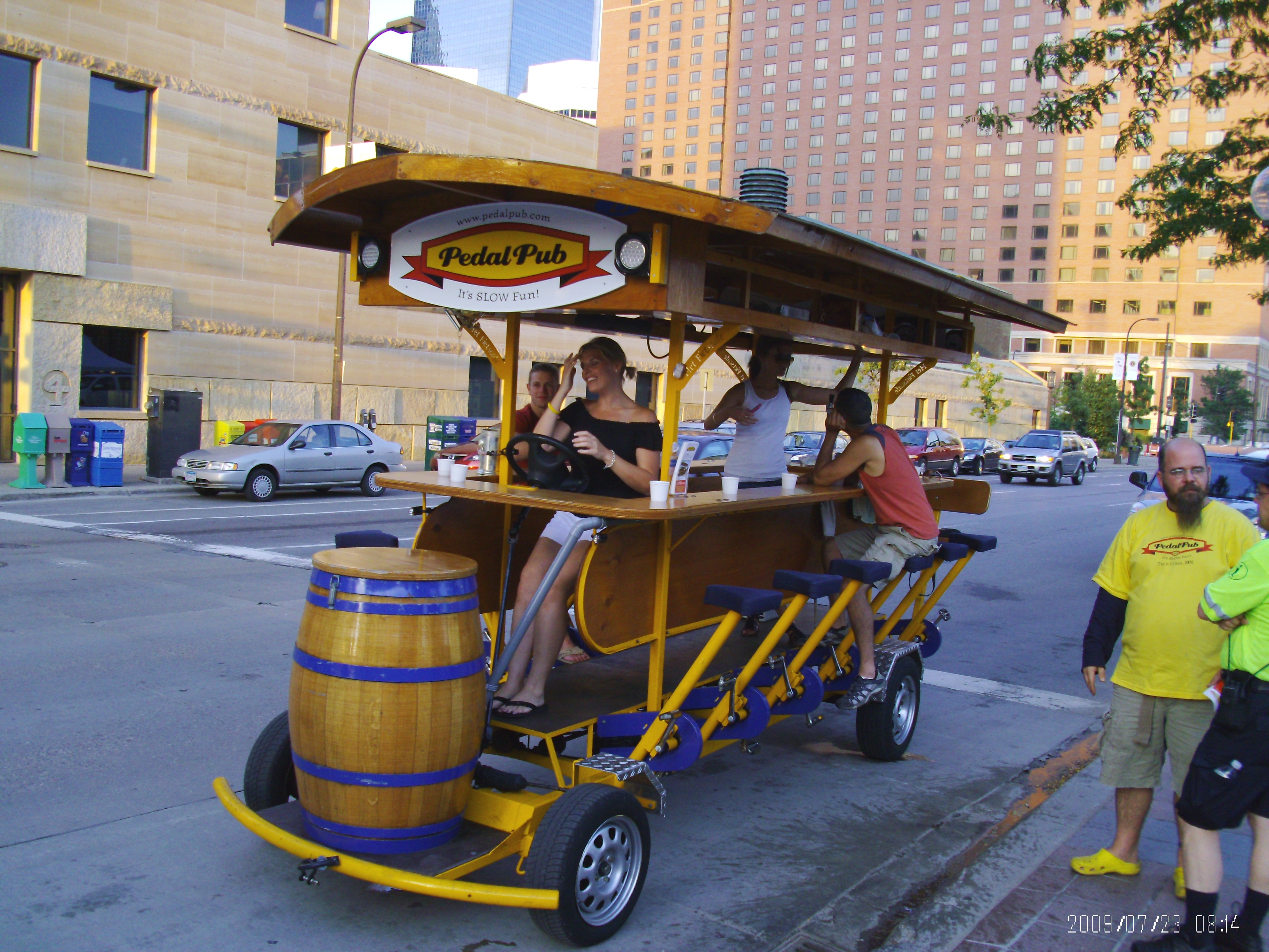 Sidewalk dining on the downtown Minneapolis mall is nice because the only vehicles allowed thru the mall are busses. And the Pedal Pub, a cool way for a group to go bar-hopping. The folks who rode past us that evening all appeared to be having a fun time. Here are a couple of photos I took.